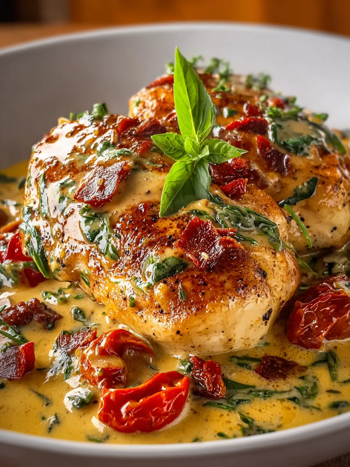 This creamy Tuscan chicken is a delicious crockpot dish that combines tender chicken breasts with a rich sauce of cream, chicken broth, sun-dried tomatoes, garlic, spinach, and Parmesan cheese.