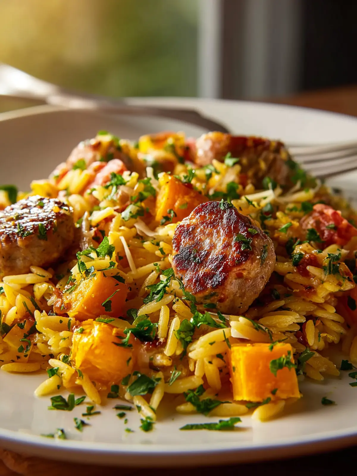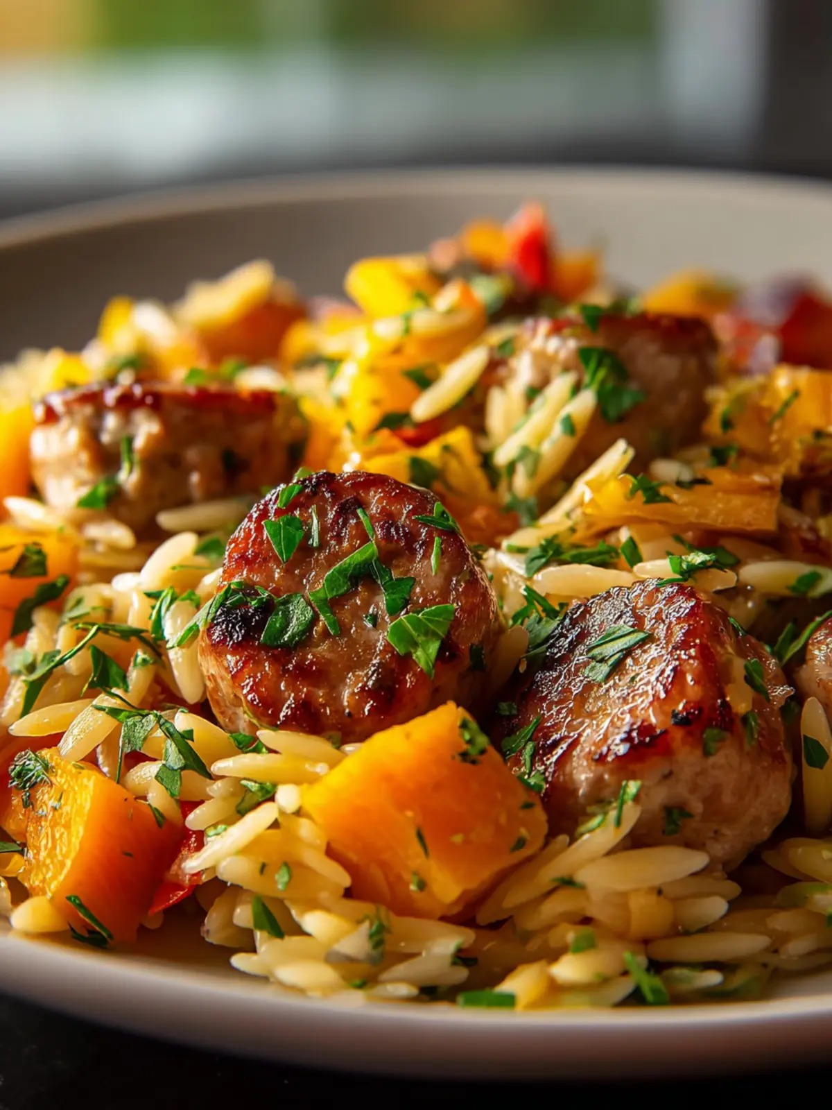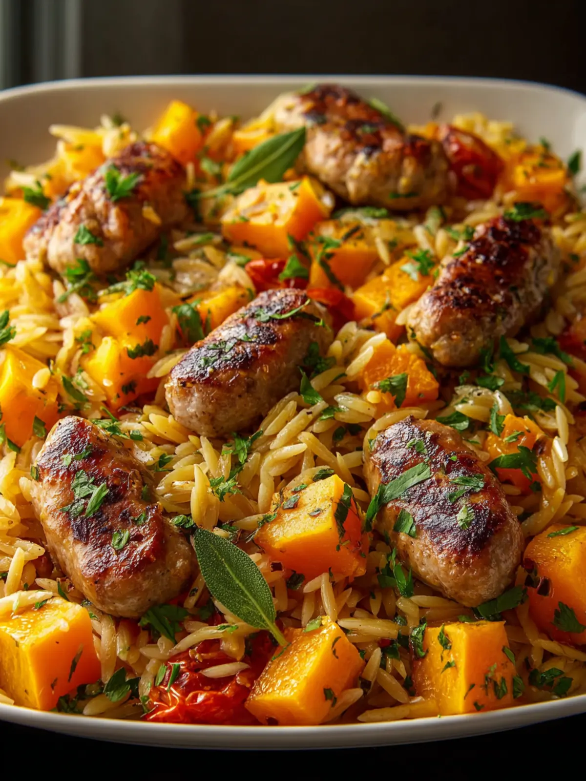 A delicious and easy sheet pan dinner featuring chicken sausage, butternut squash, and orzo, perfect for a weeknight meal.