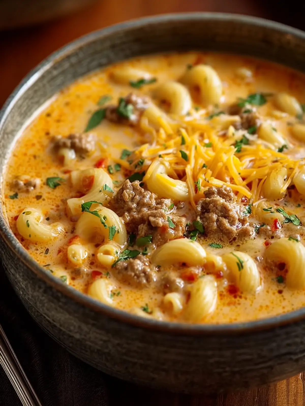 When the chill of the evening sets in or after a long day of work, there’s nothing like curling up with a bowl of this cheesy, hearty soup. It’s a dish that invites memories of summer barbecues with friends, wrapped in nostalgia and warmth. Each spoonful is loaded with tender macaroni, seasoned ground beef, and a creamy cheese blend that is simply irresistible — a true family favorite.