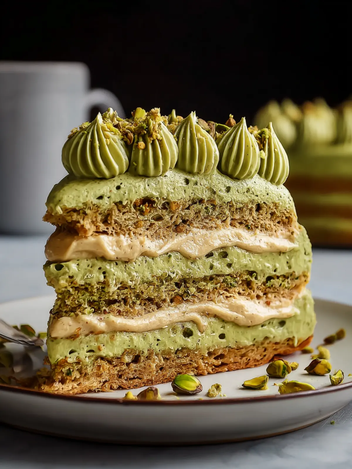 - For an extra touch, you can decorate the layered cake with additional crushed pistachios on top.